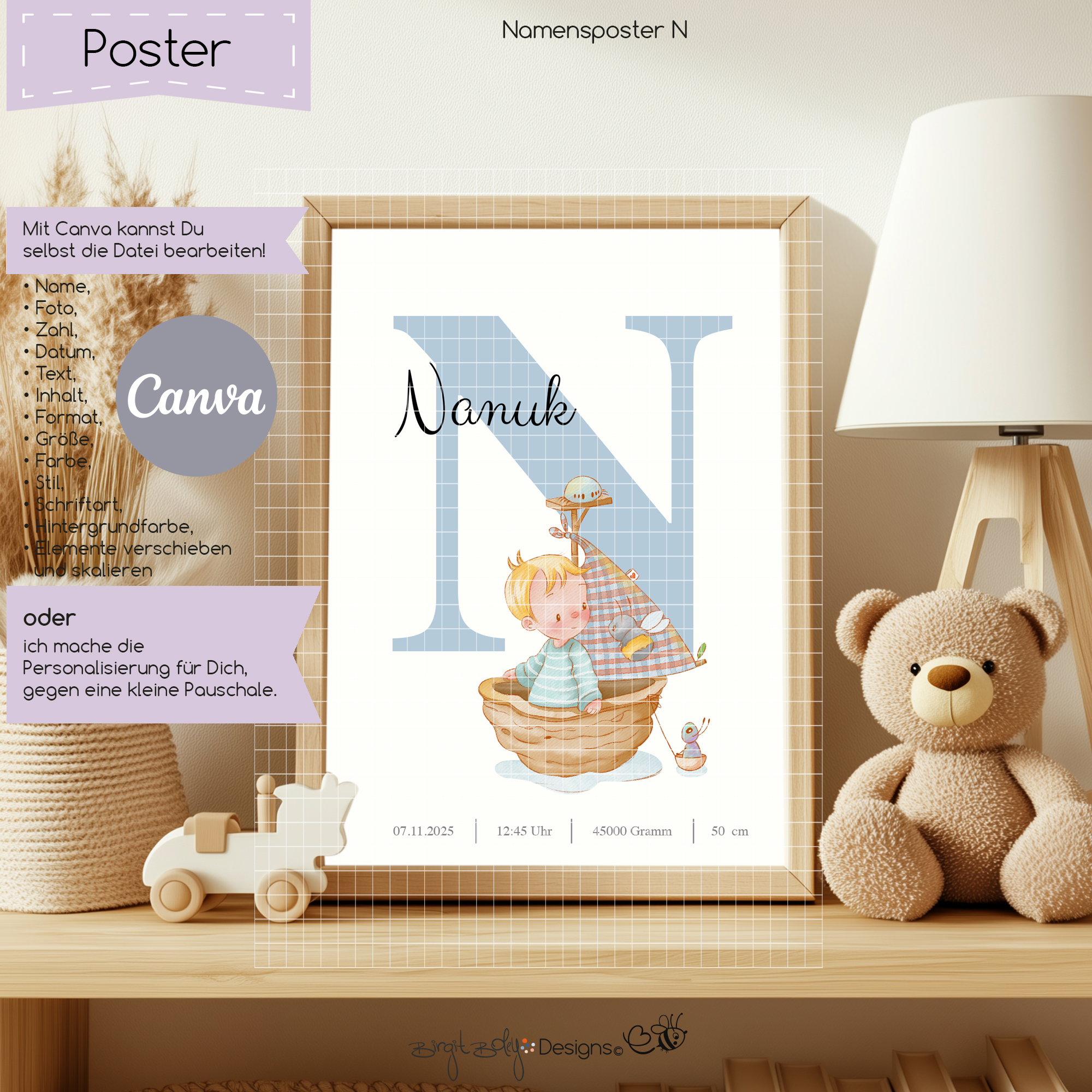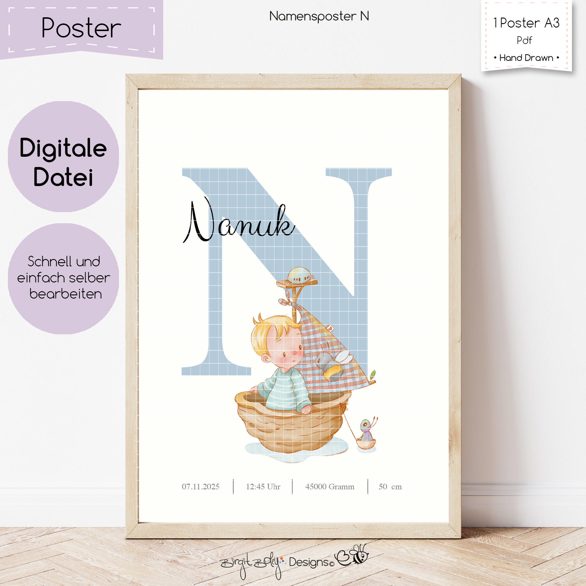Du erhältst ein digitales Poster, dass du selbst bearbeiten kannst. Du hast die Möglichkeit den Namen und den Anfangsbuchstabe zu ändern.